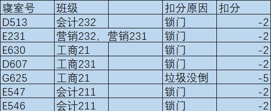 每周中午12:30,工商管理学院对全体本科生宿舍进行检查。在检查过程中发现大多数宿舍能够保持整体干净整洁,不乱扔垃圾,桌面摆放整齐,对这些优秀宿舍给予表扬。也有一些寝室内务卫生方面有待加强。现将检查结果公示如下: