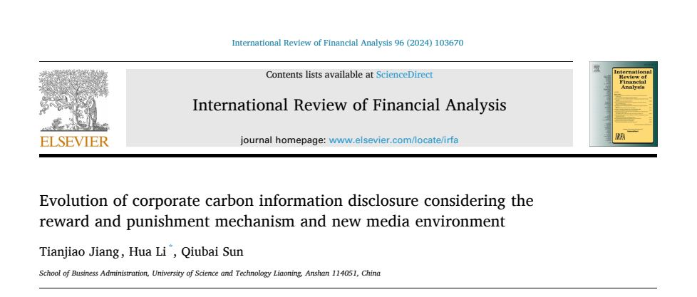 近日,我院风险管理与控制导学团队李华教授指导的硕士研究生姜天娇为第一作者在SSCI期刊International Review of Financial Analysis(中科院一区TOP)发表了题为“Evolution of corporate carbon information disclosure considering the reward and punishment mechanism and new media environment”的研究论文。该论文聚焦于企业碳信息披露决策的内在逻辑和动态演变,分析了奖惩机制和新媒体环境对企业碳信息披露决策过程中各参与主体策略选择的影响。