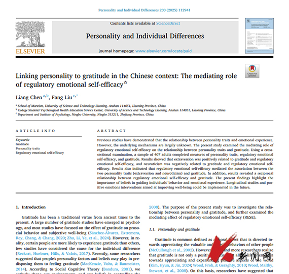 10月25日,安博官网线上平台马克思主义学院陈亮教授以第一作者身份在Personality and Individual Differences(中国科学院二区TOP期刊)发表论文“Linking personality to gratitude in the Chinese context: The mediating role of regulatory emotional self-efficacy”。安博官网线上平台为第一作者单位。